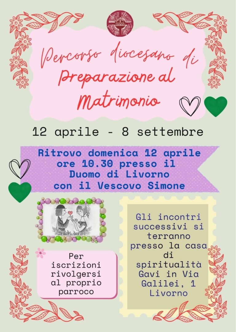 Ultime News Programma delle celebrazioni liturgiche della Settimana Santa 2026 nella Cattedrale, presiedute dal Vescovo Simone Colletta pro Terra Santa, Venerdì Santo 3 Aprile (clicca&leggi) Giovedì Santo 2 Aprile, il Vescovo Simone con gli ospiti della Fondazione Caritas Livorno (clicca&leggi) …verso il matrimonio.. Domenica 12 Aprile inizio percorso di preparazione (clicca&leggi) AAA.: Ultimi giorni per partecipare al Nuovo Bando Servizio Civile Universale, in Caritas Livorno 14 posti disponibili, scadenza domanda h 14 dell’8 Aprile (clicca&leggi) “Ascoltare e Digiunare”: messaggio di Papa Leone per la Quaresima (clicca&leggi) 24 Marzo: Giornata dei missionari martiri (cliccaVedi&Scarica sussidi per l’animazione) Disponibili i sussidi CEI per la Quaresima e la Pasqua (clicca&scarica) archivio news News dagli Uffici Eventi Venerdì 27 Marzo h 21, Via Crucis cittadina, presieduta dal Vescovo (clicca&Vedi foto evento) Pastorale Familiare 25 Marzo, Solennità dell’Annunciazione: Accogliere la vita con Maria, sussidio a cura dell’Ufficio diocesano di pastorale familiare (cliacca&Scarica) Parrocchie Estate 2026: Settimane familiari In Evidenza Quaresima, sussidi a cura Caritas italiana (cliccaVedi&Scarica) In Evidenza Quaresima: tempo per Pensare, Ascoltare, Scoprire, Vedere, Vivere (clicca&leggi) Formazione Oratori&Sport: prossimo incontro di formazione Sabato 11 Aprile (clicca&leggi) Pastorale Familiare Percorsi di Luce, Venerdì 17 Aprile prossimo incontro (clicca&leggi) Ufficio Scuola E Fu Notte e Fu Giorno – L’alternarsi di luce e tenebre nel mistero dell’uomo (clicca&Vedi video incontri) Almanacco CCIBeweb cathedral Calendario Pastorale Il VescovoMons. Simone Giusti Biografia Stemma Pubblicazioni Agenda del Vescovo 1 Aprile 2026 - 09:30 Ritiro del clero 1 Aprile 2026 - 17:30 S. Messa crismale 2 Aprile 2026 - 12:30 Preghiera con il Vescovo Simone, pranzo di Pasqua e scambio di auguri con il gli ospiti della Fondazione Caritas Livorno 2 Aprile 2026 - 21:30 S. Messa in “Coena Domini”, presieduta dal Vescovo Simone vedi tuttiDiocesi sul Web Diocesi Livorno Canale Ufficiale della Diocesi di Livorno LA SETTIMANA IN TV - puntata del 27 marzo 2026 YouTube Video VVVYRVRUU1F1YUNzUTF4ME5ibXFGMGNBLkFuM3FJdDQwUll3 Case di Spiritualità caret-down caret-up caret-left caret-right Santa Caterina Santa Giulia Alma pace Laudato si