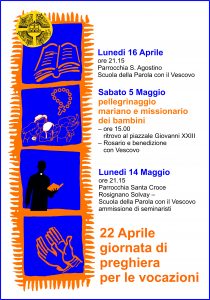 - Lunedì 14 Maggio ore 21.15 – Parrocchia Santa Croce a Rosignano Solvay, Scuola della Parola con il Vescovo Simone e ammissione di seminaristi al Seminario