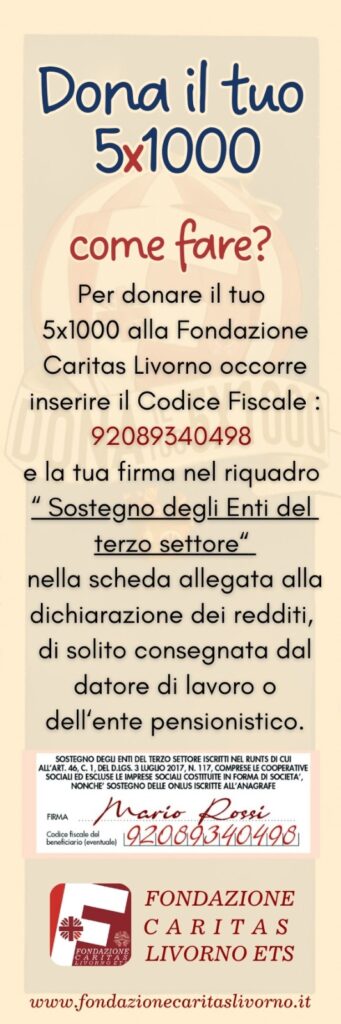 Fondazione Caritas Livorno 10 Ottobre 2024 5×1000 alla Fondazione Caritas Livorno x sostenere i Centri di Ascolto (clikkaLeggiFirma&diffondi!!!) Grazie!!! Una firma di solidarietà x moltiplicare dignità!!!! clicca qui e scarica: Mod. per scelta 5×1000 Mod. per scelta 5x1000