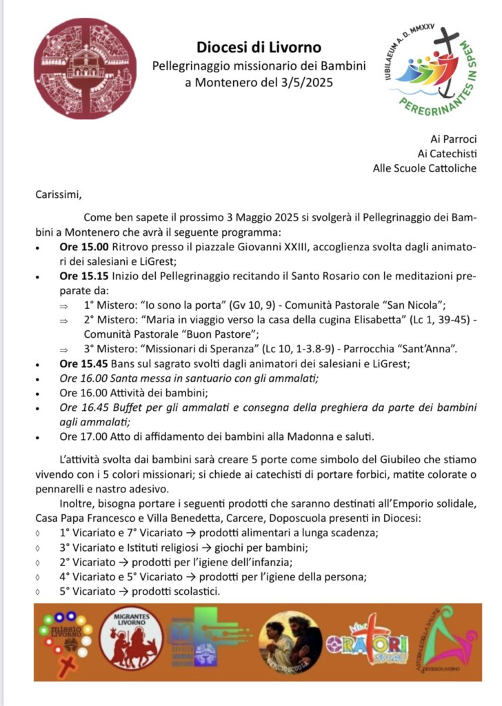 Eventi 10 Maggio 2025 Montenero, Sabato 3 Maggio, clicca&vediImmagini del pellegrinaggio missionario dei bambini e Giornata del malato e persona disabile clicca qui: https://www.lasettimanalivorno.it/la-giornata-del-malato-e-del-disabile-2/ https://www.lasettimanalivorno.it/attraverso-la-porta-della-speranza/