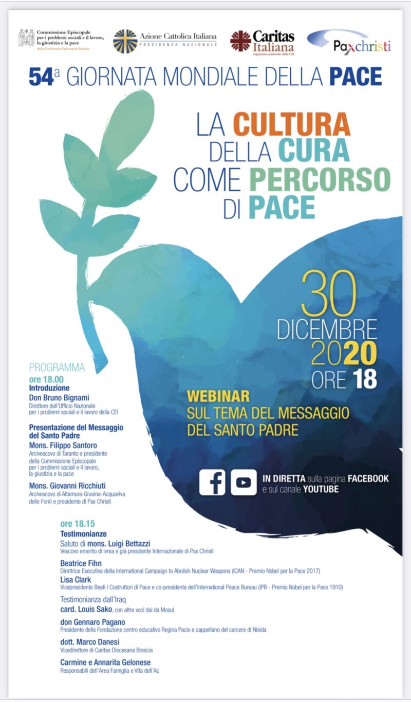 Mercoledì 30 dicembre ore 18 riflessioni e testimonianze sul Messaggio di papa Francesco (diretta Facebook e YouTube) Clicca qui e scarica: Sussidio-Preghiera-Giornata-Pace-2020