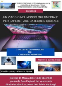 Eventi 8 Marzo 2021 “Un viaggio nel mondo multimendiale per saper fare catechesi digitale” incontro per catechisti e animatori, a cura Centro Pastorale per l’Iniziazione Cristiana e Commissione tutela minori e adulti vulnerabili giovedì 11 Marzo Descrizione: Sala Fagioli – Vescovado e diretta Inizio: 11/03/2021 18:30 Fine: 11/03/2021 18:30 Categorie: Eventi Indirizzo: Città: Livorno Regione: Toscana Paese: Italia